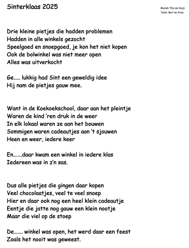 Wij denken dat hij ons schooltje niet voorbij zal rijden en om hem een warm welkom te heten hebben wij een prachtig lied gemaakt dat we de komende dagen goed gaan oefenen. Hieronder de tekst en de melodie. Oefenen maar!